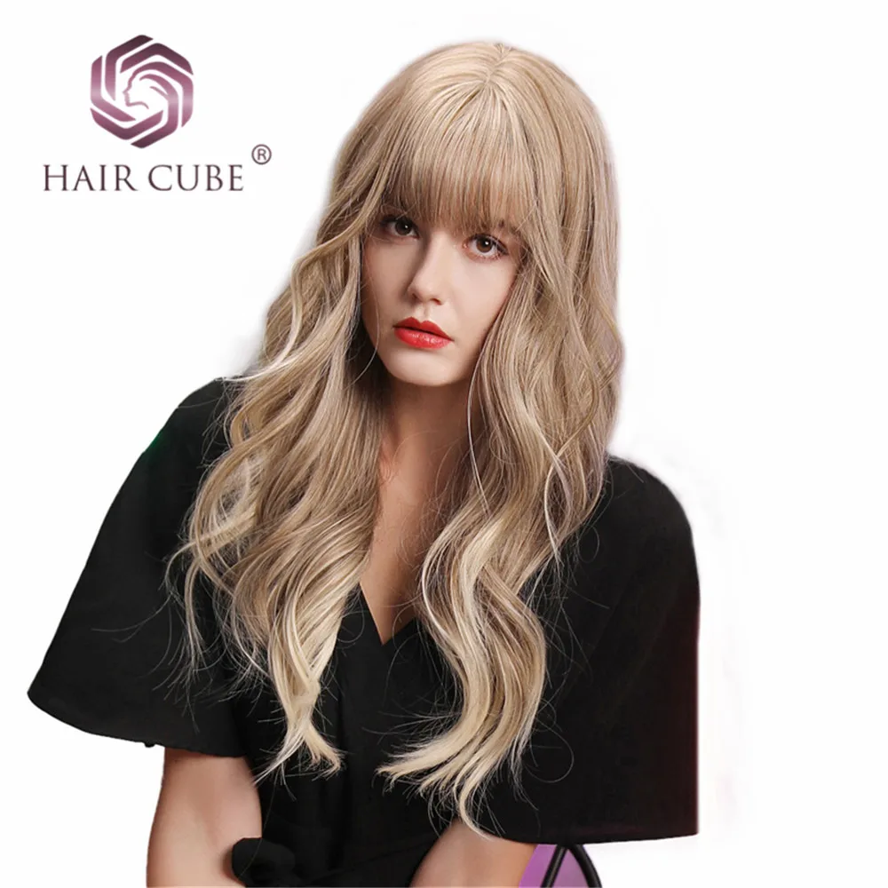 Haircube 22 inch Long Synthetic Wigs with Bangs Highlights Light Brown Color Heat Resistant Fiber N